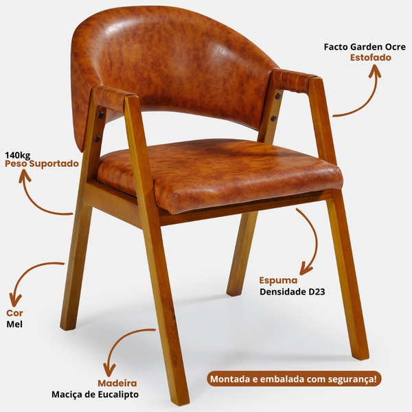 As cadeiras complementam o conjunto com um toque sofisticado: estrutura em madeira, encosto curvo anatômico e assento estofado, que garantem ergonomia e aconchego para o uso diário. O acabamento em tom amadeirado harmoniza perfeitamente com o estofado em cor caramelo, criando uma composição acolhedora e atemporal.