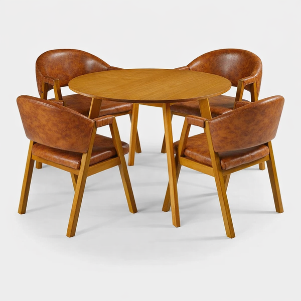Este conjunto de jantar une design contemporâneo e conforto absoluto, perfeito para cozinhas e salas de jantar modernas. A mesa redonda em madeira traz um visual leve e elegante, favorecendo a circulação e a interação no ambiente, enquanto suas linhas simples valorizam diferentes estilos de decoração.
