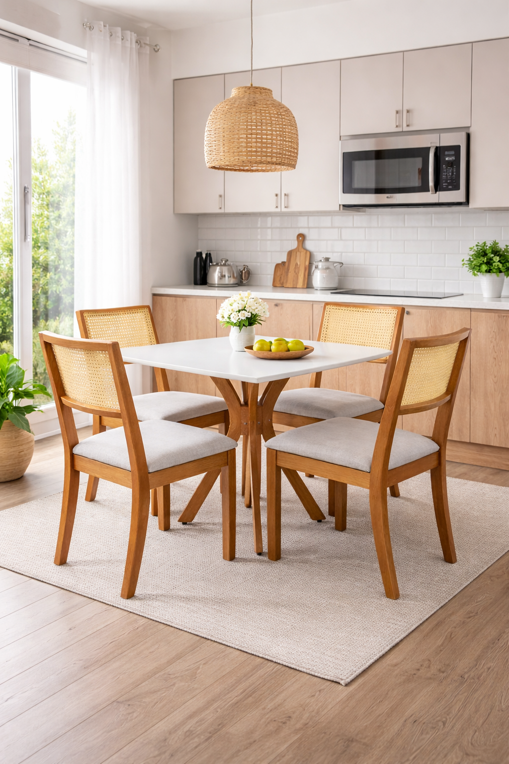 Na sala de jantar, a mesa quadrada é perfeita para criar um ambiente acolhedor e organizado, especialmente para famílias pequenas ou para quem gosta de manter tudo à mão. Em espaços menores, como cozinhas compactas, ela otimiza o espaço sem perder o charme.
